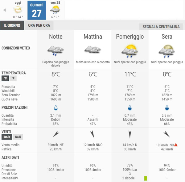 Secondo gli esperti di 3bmeteo domani, Giovedì 27 Novembre avremo cieli molto nuvolosi o coperti per tutto l’arco della giornata, con deboli piogge dal pomeriggio.