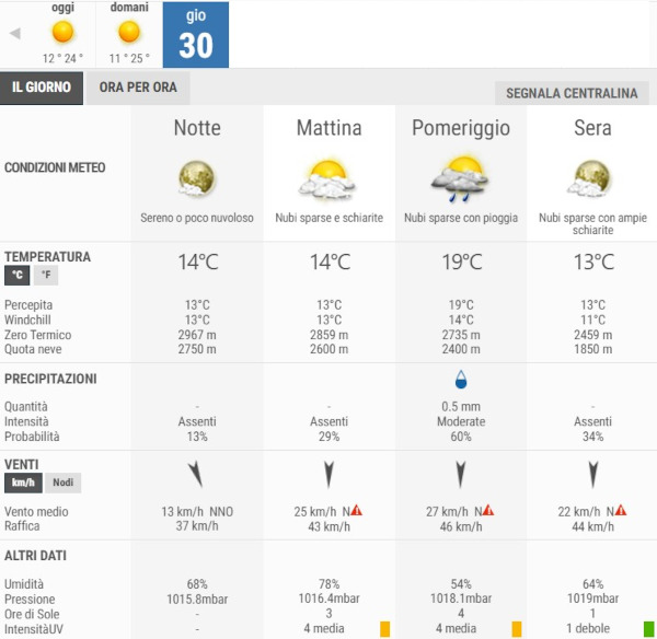 Gioevedì 30 Aprile avremo nubi in progressivo aumento con deboli piogge al pomeriggio. Rasserena in serata.