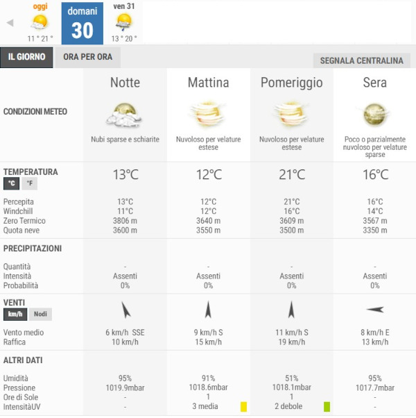 Secondo gli esperti di 3bmeteo domani, Giovedì 30 Ottobre avremo cieli in prevalenza parzialmente nuvolosi per l’intera giornata, non sono previste piogge.