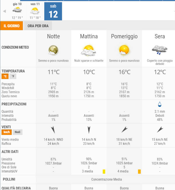La temperatura massima registrata pare che sarà di 16°C, la minima di 10°C.