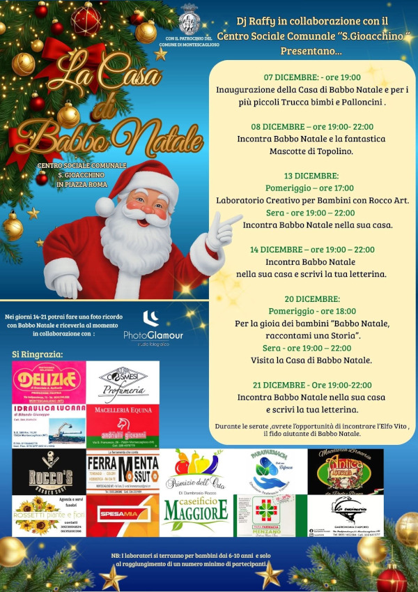 L’iniziativa, promossa da Dj Raffy in collaborazione con il Centro Sociale Comunale “San Gioacchino” e patrocinata dal Comune di Montescaglioso, offrirà un ricco programma di attività dedicate ai più piccoli e non solo, trasformando il paese in un vero villaggio incantato.