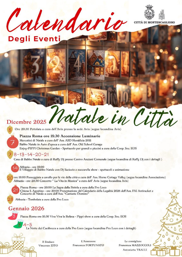 Anche la Città di Montescaglioso si prepara a vivere un dicembre speciale, con un programma natalizio ricco di appuntamenti dedicati a famiglie, bambini e momenti di solidarietà.