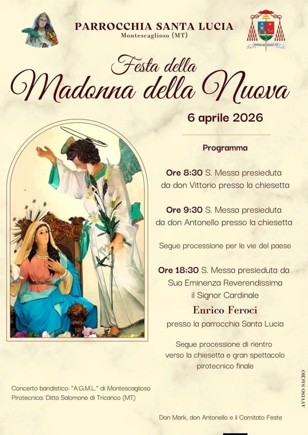 Ed e grande attesa a Montescaglioso per la tradizionale festa della Madonna della Nuova, in programma lunedì 6 aprile 2026 e organizzata dalla Parrocchia Santa Lucia.