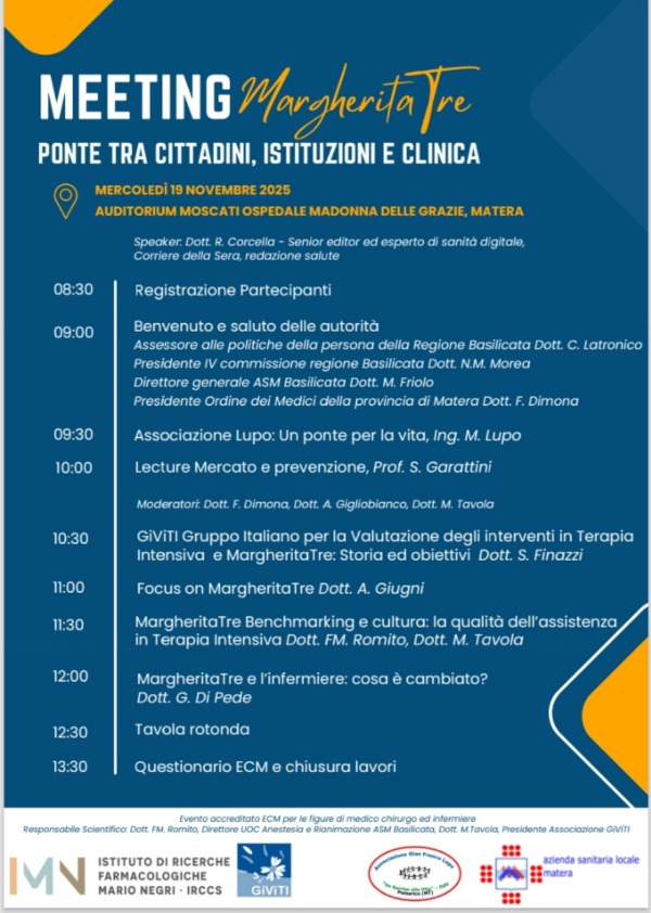 L’iniziativa, corso di formazione ECM rivolto a medici e infermieri, è patrocinata dall’Azienda Sanitaria Locale di Matera in collaborazione con l’Istituto di Ricerche Farmacologiche Mario Negri – IRCCS e l’Associazione GiViTI e con la preziosa collaborazione dell’associazione Gianfranco Lupo.