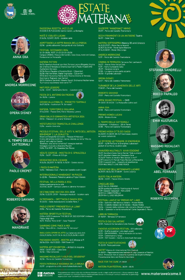 Ulteriori e puntuali informazioni sull’Estate materana 2024, con la possibilità di cercare e filtrare gli eventi a pagamento e gratuiti, si potranno trovare sul portale “www.materawelcome.it” con l’app per dispositivi mobili.