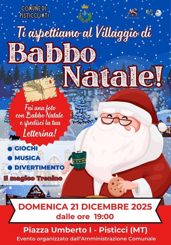 L’Amministrazione Comunale di Pisticci è lieta di invitare tutti i bambini e le loro famiglie al Villaggio di Babbo Natale, per vivere insieme momenti magici e indimenticabili.