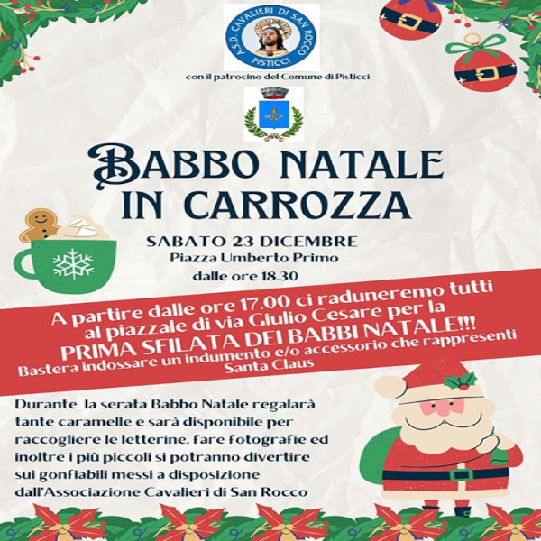 - Un’iniziativa per i più piccoli con la sfilata dei Babbo Natale in carrozza, a cura dell’Associazione Cavalieri di San Rocco.