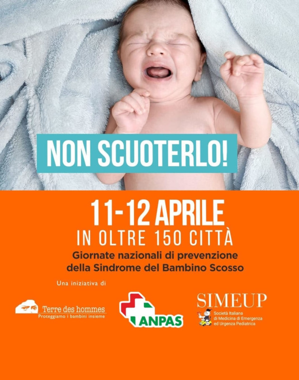Terre des Hommes e SIMEUP (Società Italiana di Medicina di Emergenza e Urgenza Pediatrica) con SIP, ANPAS, FIMP e la Rete Ospedaliera contro il Maltrattamento Infantile saranno presenti in oltre 150 città italiane per informare i cittadini sui pericoli della sindrome del Bambino Scosso e su come prevenirla.