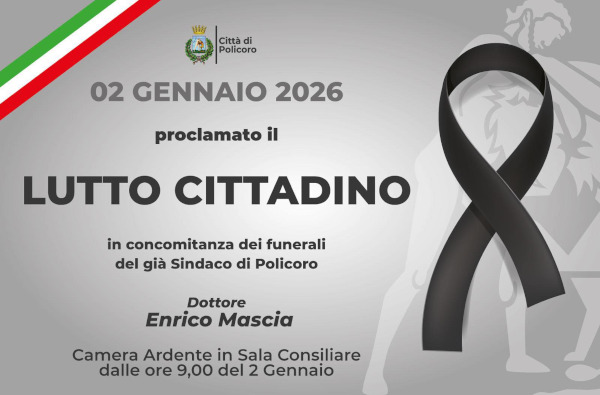 Domani, venerdì 2 gennaio, come fa sapere l’Amministrazione di Policoro è stato proclamato il lutto cittadino per la scomparsa dell’Amm. Dott. Enrico Mascia, già Sindaco della città dal 2017 al 2022.