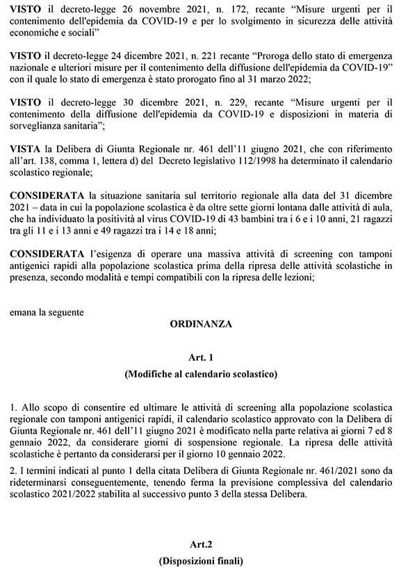 È stata poi pubblicata sul Bollettino Ufficiale della Regione Basilicata n. 2 – Speciale del 6 gennaio 2022 l’Ordinanza del Presidente della Giunta Regionale n° 1 del 5 Gennaio 2022: