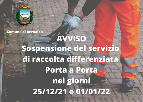 “Il servizio di raccolta differenziata domiciliare Porta a Porta resterà sospeso nelle giornate di Sabato 25 Dicembre 2021 e Sabato 1 Gennaio 2022.