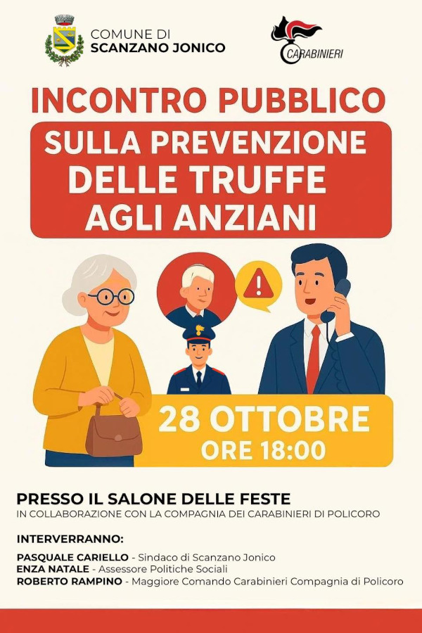 A Scanzano Jonico Martedì pomeriggio, a partire dalle ore 18:00, presso il Salone delle Feste del Palazzo Baronale, il Sindaco Pasquale Cariello con l’assessore Vincenza Natale, vi aspettano per parlare di truffe ai danni degli anziani.