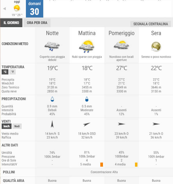 Secondo gli esperti di 3bmeteo, domani, Mercoledì 30 Agosto, avremo molto nuvolosi al mattino con deboli piogge.