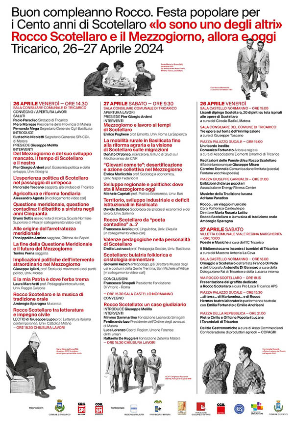 “Il 26 e 27 Aprile 2024 Tricarico festeggia il compleanno di Rocco Scotellaro con convegni, Poesie, canzoni, immagini, performance.