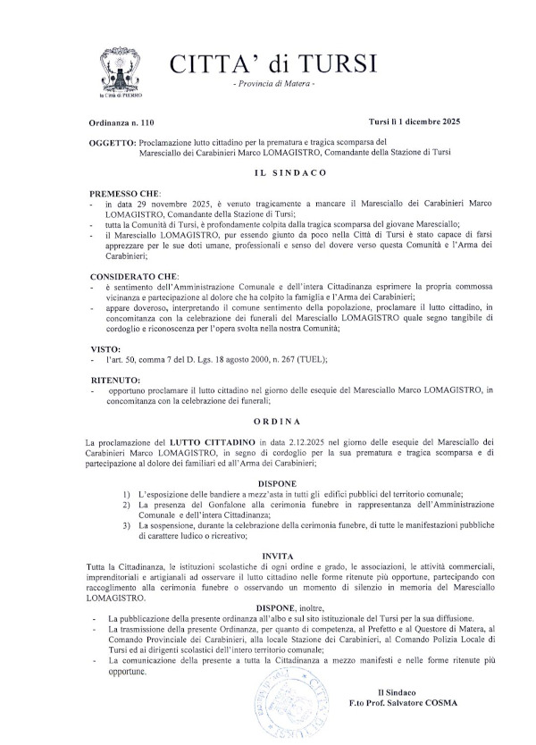 In concomitanza con le esequie, il Comune di Tursi così come quello di Laterza, proclameranno il lutto cittadino e le bandiere a mezz’asta degli uffici pubblici.