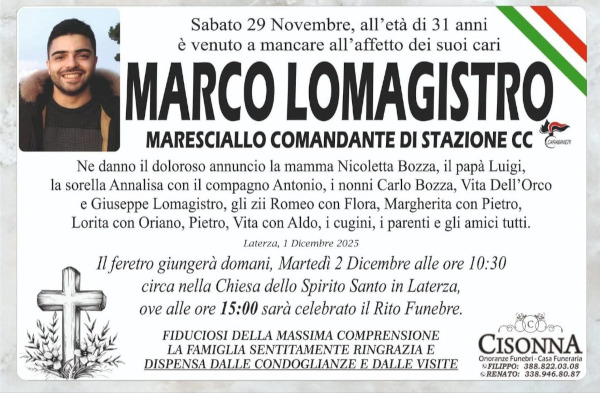 Saranno celebrati domani, martedì 2 Dicembre alle ore 15:00 a Laterza nella Chiesa dello Spirito Santo in via Puglia, 55 i funerali del comandante della stazione dei Carabinieri di Tursi, il Maresciallo Marco Lomagistro, scomparso sabato mattina nella stazione in cui prestava servizio.