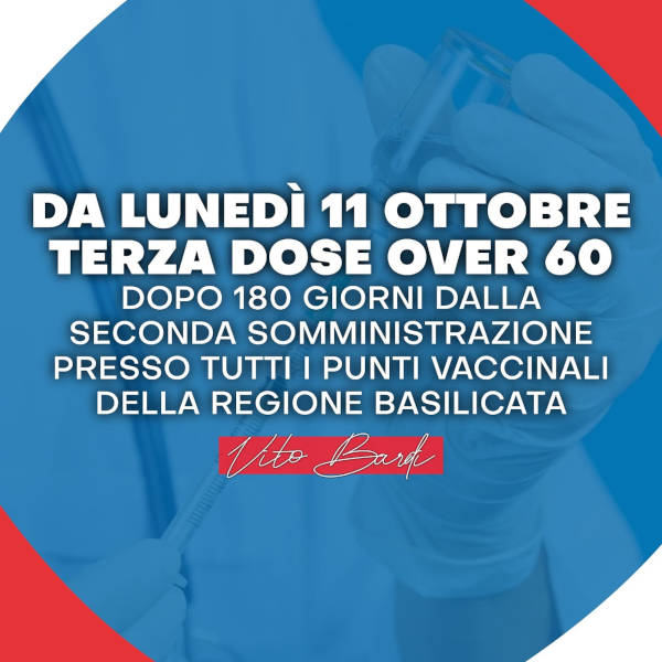 “Terze dosi per gli Over60: già da oggi, 11 Ottobre, sarà possibile accedere agli hub vaccinali lucani.